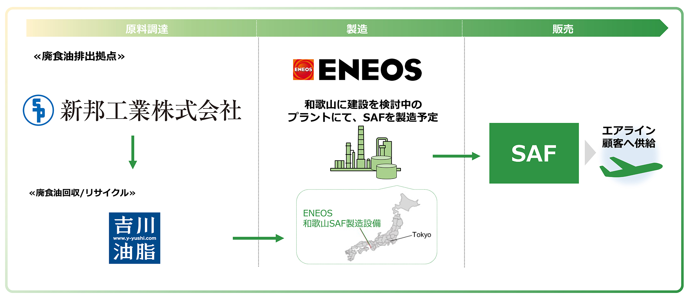 2025年9月22日、ENEOS株式会社様及び株式会社吉川油脂様との三者連携協定を結び、当社千葉工場で回収された廃食油をSAFの原料として活用する取り組みに関する基本合意を締結し、2025年10月より廃食油の回収を開始しました。当協定に基づく取り組みでは、当社千葉工場で回収された廃食油が株式会社吉川油脂様により回収され、将来的には、ENEOS株式会社様が事業化を進めるSAFの製造プラント(和歌山県有田市)において、原料として使用する予定です。